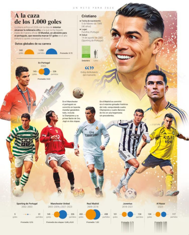 对他而言,2026年团队层面的最高目标是世界杯,但个人赛道的终极任务同样明确:成为足球史上首位撞线千球的传奇。
