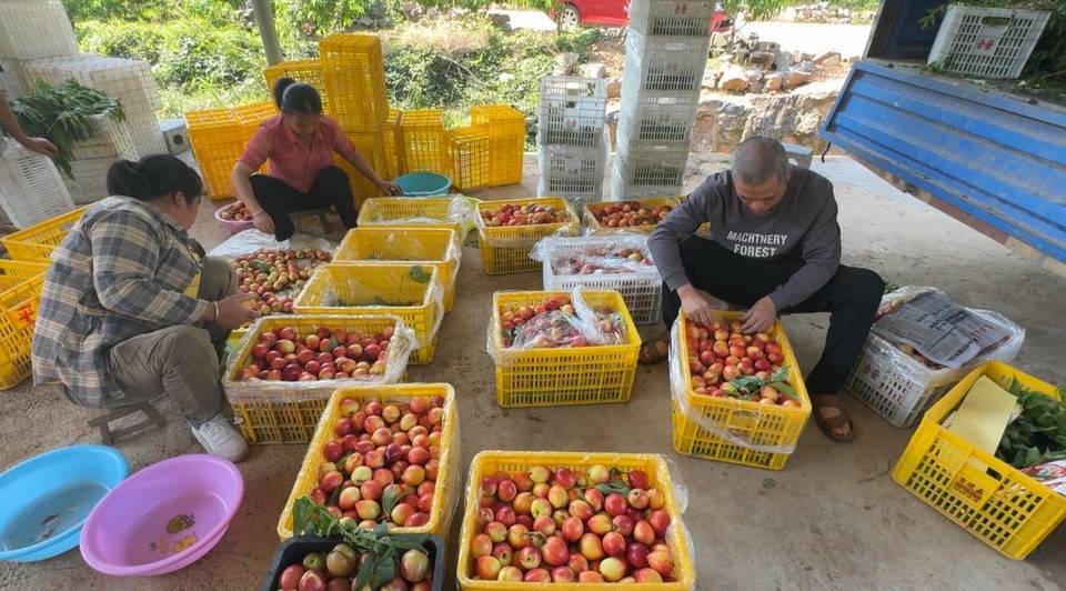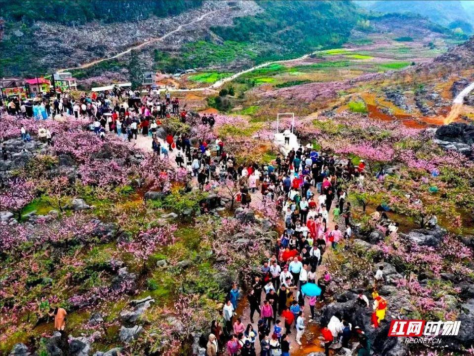 采摘的鲜桃正在打包准备装车。“以工代赈+产业”:激活乡村经济动能工作队立足村情,通过以工代赈推动当地产业多元发展:一产提质,新植桃树2000余亩,推广标准化种植技术,全面提升桃果品质;二产增效,计划申报“一村一品”项目,对接知名企业开展桃产品深加工,加大腌桃、桃胶、桃花酒等产品研发,延伸产业链;三产赋能,申报国家级AAA旅游景区,试点“山顶林戴帽,山中果缠腰,山下吨粮田”发展模式,构建集农事体验、休闲采摘、旅游研学于一体的产业带;加大农副产品采购力度,强化产区与城市协作,进行消费帮扶。这些举措预计带动全村收入突破5000万元,人均年增收超过3200元,全年村集体经济达到10万元以上,让200余人实现稳定就业。“以工代赈+文化”:奏响农旅融合乐章桃花灼灼、长鼓舞翩跹、亲子采摘乐……香花井村沿河两岸与桃花谷生态园内,“石上生花”的自然奇观与丰富多彩的文化活动吸引了众多游客。工作队深入挖掘瑶族民俗、农耕文化等资源,通过举办“村BA”篮球赛、艺术墙绘、“最美农家”评选等活动,推动传统文化与乡村振兴创新融合。举报/反馈