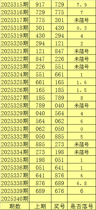福彩3D第2025339奖号676,重号落号。在最近100期(第2025240期-2025339期)中,重号落号68期;最近20期重号落号概率为70%;最近10期重号落号概率为80%。本期防重号中号码轮空。