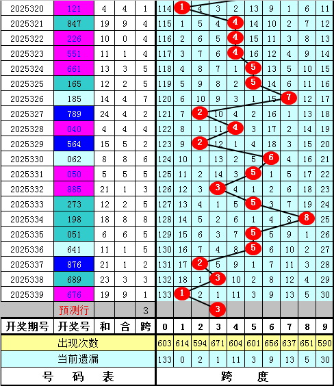 福彩3D第2025339期最大跨度开出1,近期最大跨度波动较大,本期预计最大跨度在1-5区段出现,最大跨度关注12345,重点关注跨度3。
