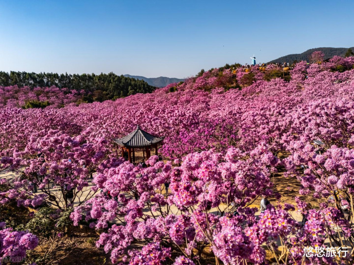 12月中下旬至次年1月下旬,是紫花风铃木的盛花期。江门市新会区大泽镇莲塘村山头坪,超过6000棵紫花风铃木同时盛放,直接把整个山谷染成梦幻的粉雾。