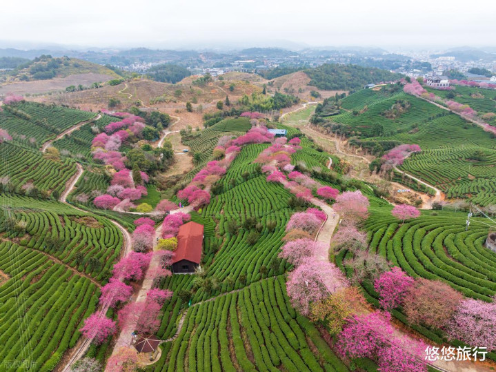 1月下旬至3月,龙岩漳平市永福镇,数万株不同品种的樱花陆续开放。十里茶道,千亩樱园,茶山叠翠,樱花粉雾。粉红色的樱花点缀在翠绿的茶垄间,梦幻而浪漫。