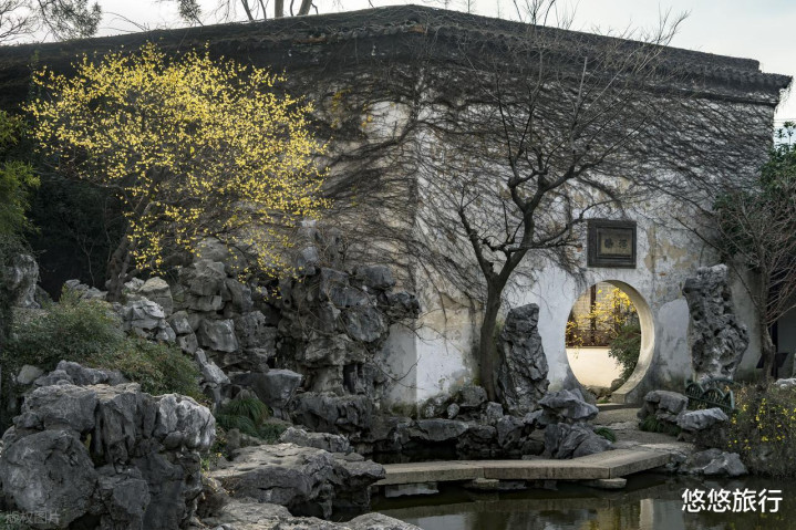 西园寺内黄墙素瓦,腊梅香混着香火气禅意浑然天成。艺圃腊梅常伴水而生,推窗即见金黄倒映蓝色池中。