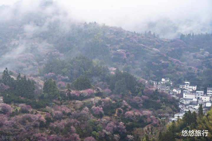腊梅、红梅、白梅三花同庆,数万株野生老梅树沿山势泼墨,当花枝轻颤,檐角便接住了整个皖南的春光。清晨还有云海,盛开的梅花让这里变成花海村落。