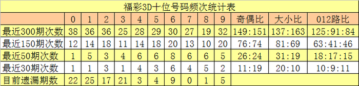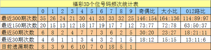 十位分析:前50期出号频次较高的号码为:6开出8次,4、5、7、8开出6次;出号频次较低的号码为:0开出1次,2开出3次,3开出4次。该位号码大小比为31:19,012路比为18:17:15。本期该位排除两码1、9,注意号码0、2、7,精选一码0。